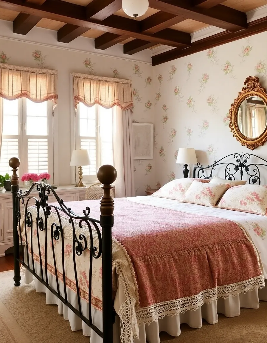 Incorporate vintage-inspired furniture—a distressed armoire, a gilded mirror, and a chandelier with candle-style bulbs. Floral-patterned curtains and a lace bedspread complete the look, making your bedroom feel like a countryside château.